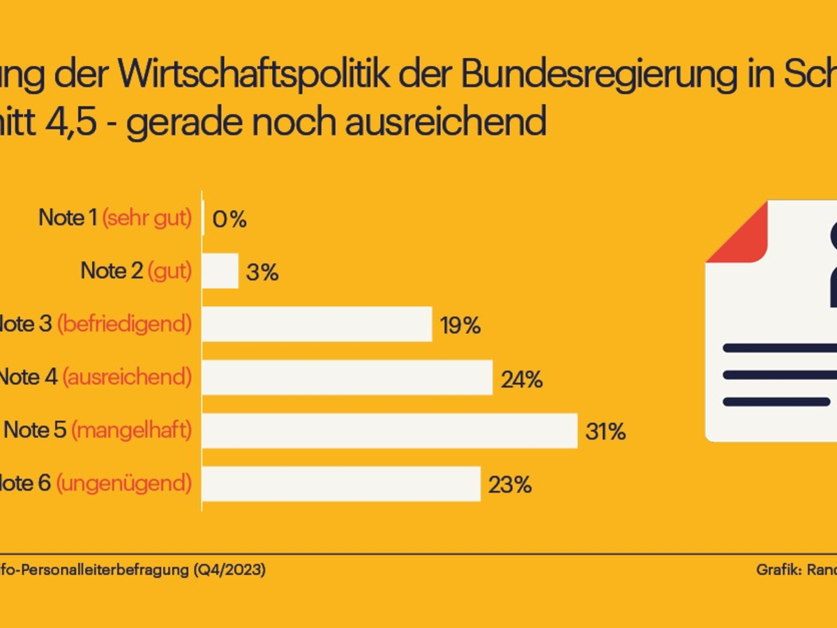 Haushaltskrise, Investitionsstau und schwache Konjunktur: Die Zeiten sind fĂŒr Betriebe und ihre Personalverantwortlichen nicht gerade einfach. Dies schlĂ€gt sich auch in der EinschĂ€tzung der Arbeit der aktuellen Bundesregierung nieder. Denn in der aktuellen Randstad-ifo-Personalleiterbefragung Q4 2023 wurden mehr als 600 Personalleiter:innen deutscher Unternehmen gebeten, die Wirtschaftspolitik der Ampel-Koalition in Schulnoten von 1 (sehr gut) bis 6 (ungenĂŒgend) zu bewerten - die Mehrheit (31%) vergab dabei die Note 5 (mangelhaft). Jeweils etwa ein Viertel vergaben die Noten 4 (ausreichend) und 6 (ungenĂŒgend). Keiner der Befragten vergab die Note 1 und nur 3% bescheinigten der Ampel mit der Note 2 eine gute Wirtschaftspolitik.