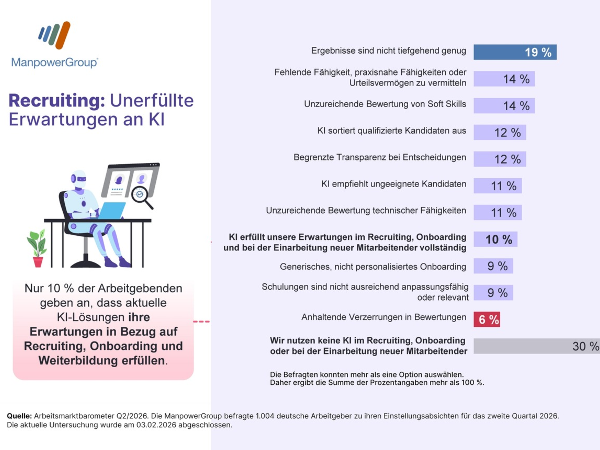 *Der Netto-Beschäftigungsausblick (NBA) errechnet sich aus dem Anteil der Unternehmen, die einen Beschäftigungsanstieg erwarten, abzüglich derer, die einen Beschäftigungsrückgang prognostizieren. An der Befragung nahmen weltweit über 47.100 und deutschlandweit 1.004 Unternehmen teil. Die aktuelle Untersuchung wurde im Zeitraum vom 1. Januar bis zum 3. Februar 2026 durchgeführt.
