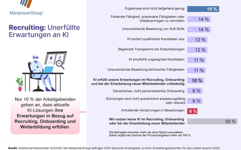 Zusätzlich zu ihren Beschäftigungsplänen hat die ManpowerGroup Arbeitgebenden nach ihrer Nutzung und dem Mehrwert von KI gefragt. Den größten ROI sehen deutsche Unternehmen im Bereich Einsatzplanung und Prognosen (17 Prozent), jedoch gibt rund jedes fünfte Unternehmen (22 Prozent) an, noch gar keinen positiven Effekt durch den Einsatz von KI feststellen zu können. Nur 10 Prozent der Arbeitgebenden sind der Meinung, dass aktuelle KI-Lösungen ihre Erwartungen in Bezug auf Recruiting, Onboarding und Weiterbildung vollständig erfüllen. 30 Prozent der befragten Unternehmen nutzen KI aktuell weder im Recruiting, beim Onboarding oder bei der Einarbeitung neuer Mitarbeitenden.