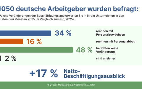 "Was wir aktuell beobachten, ist keine dramatische Trendwende, sondern eine erwartbare Reaktion deutscher Unternehmen. Nach einer Phase mit hohen oder stark schwankenden Werten pendeln sich die Erwartungen der Unternehmen auf einem mittleren bis unteren Niveau ein und reflektieren so die aktuelle Lage. Das zeigt: Der Arbeitsmarkt sortiert sich neu - in einem Umfeld, das weiterhin von Transformation geprägt ist", ordnet Iwona Janas, Country Manager der ManpowerGroup Deutschland, die Ergebnisse der Studie ein.