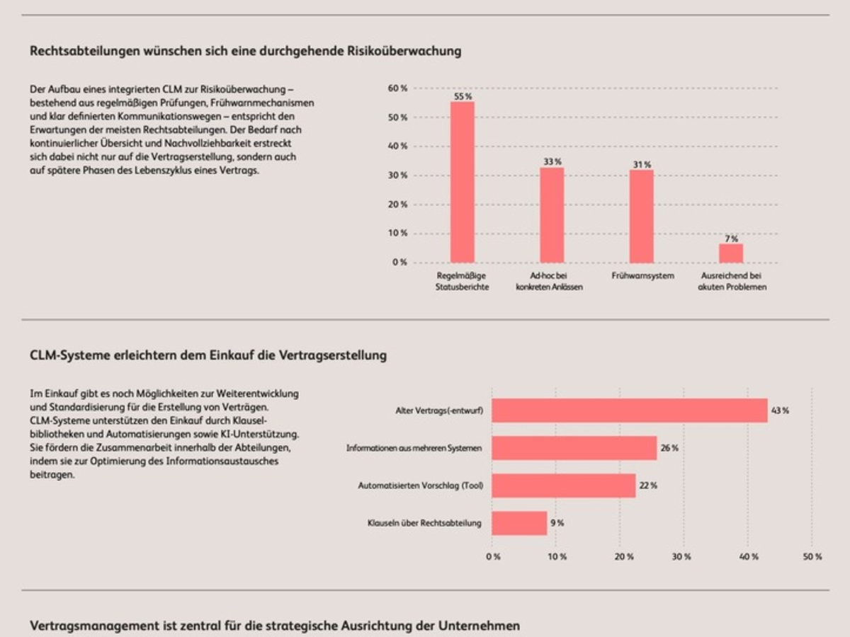Die Studie betont zudem die Bedeutung der Ganzheitlichkeit: Um das Vertragsmanagement strategisch weiterzuentwickeln, müssen von der Rechtsabteilung über den Einkauf bis hin zur Geschäftsführungsebene alle Kompetenzen ineinandergreifen und von der Reifegradanalyse und der Konzeptionierung bis zur Implementierung und nachhaltigen Verankerung von CLM-Tools alle Schritte berücksichtigt werden.