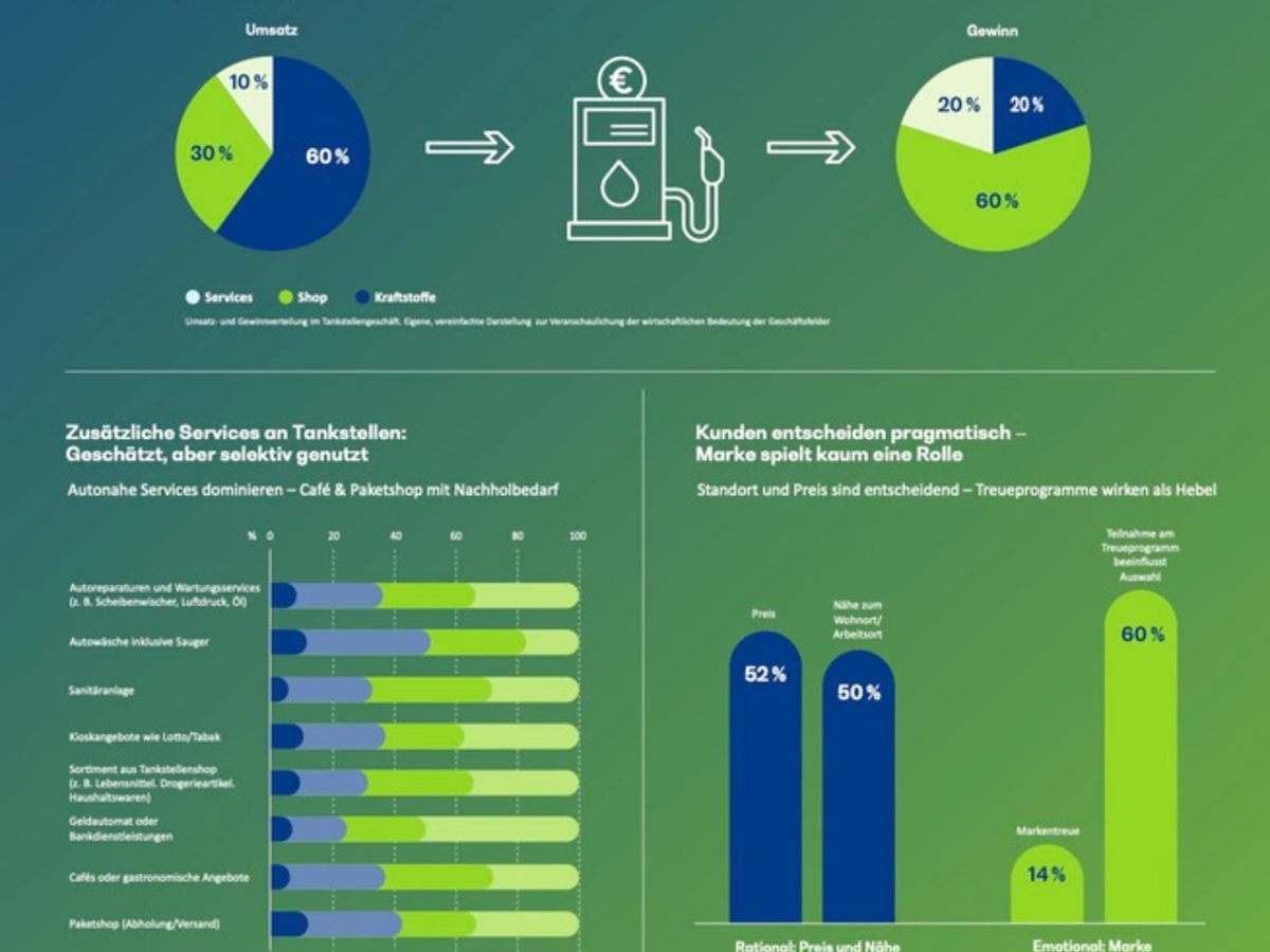 Die Tankstelle der Zukunft wird nicht mehr primĂ€r vom Kraftstoffverkauf leben. WĂ€hrend dieser heute noch 60 bis 70 Prozent des Umsatzes ausmacht, gewinnt das bereits heute margentrĂ€chtige, Shop und Service-GeschĂ€ft zunehmend an Bedeutung. Der prognostizierte RĂŒckgang fossiler Kraftstoffe und der Hochlauf der ElektromobilitĂ€t erfordern eine grundlegende Neuausrichtung.