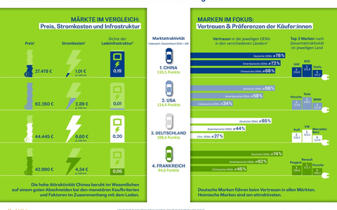 Auch das Vertrauen in Hersteller spielt eine zentrale Rolle - vor allem im internationalen Markenvergleich. In allen vier untersuchten MĂ€rkten schneiden heimische Marken am besten ab: VW fĂŒhrt in Deutschland, Renault in Frankreich, Tesla in den USA und BYD in China. BYD erzielt dabei mit 155,9 Punkten den höchsten Einzelwert im AttraktivitĂ€tsindex. In fremden MĂ€rkten hingegen verlieren diese Hersteller deutlich an AttraktivitĂ€t. Das zeigt, wie stark regionale Markenbindung und Vertrauen die Kaufentscheidung beeinflussen. Besonders chinesische Hersteller wie BYD oder MG haben in Europa trotz technischer Reife mit Imageproblemen zu kĂ€mpfen. Der Vertrauensvorsprung deutscher Marken - insbesondere im Premiumsegment - bleibt ein strategisches Kapital, das jedoch zunehmend unter Druck gerĂ€t, insbesondere bei jĂŒngeren und markenoffeneren KĂ€ufergruppen.