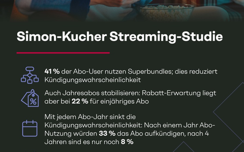 Mit 41 Prozent nutzt fast die Hälfte der Streaming-Abonnenten Superbundles. Während die User vielfältige Vorteile mit TV-Optionen genießen, sind die Kombi-Abos für Streaming-Anbieter dabei vor allem ein Mittel, die Kündigungswahrscheinlichkeit zu senken. "Wer Inhalte über ein Bundle bezieht, bleibt in der Regel länger - der wahrgenommene Nutzen steigt, spontane Kündigungen sinken", so Lisa Jäger, Partnerin bei Simon-Kucher. Für Anbieter bedeutet das: höhere Loyalität und stabilere Umsätze pro Haushalt.