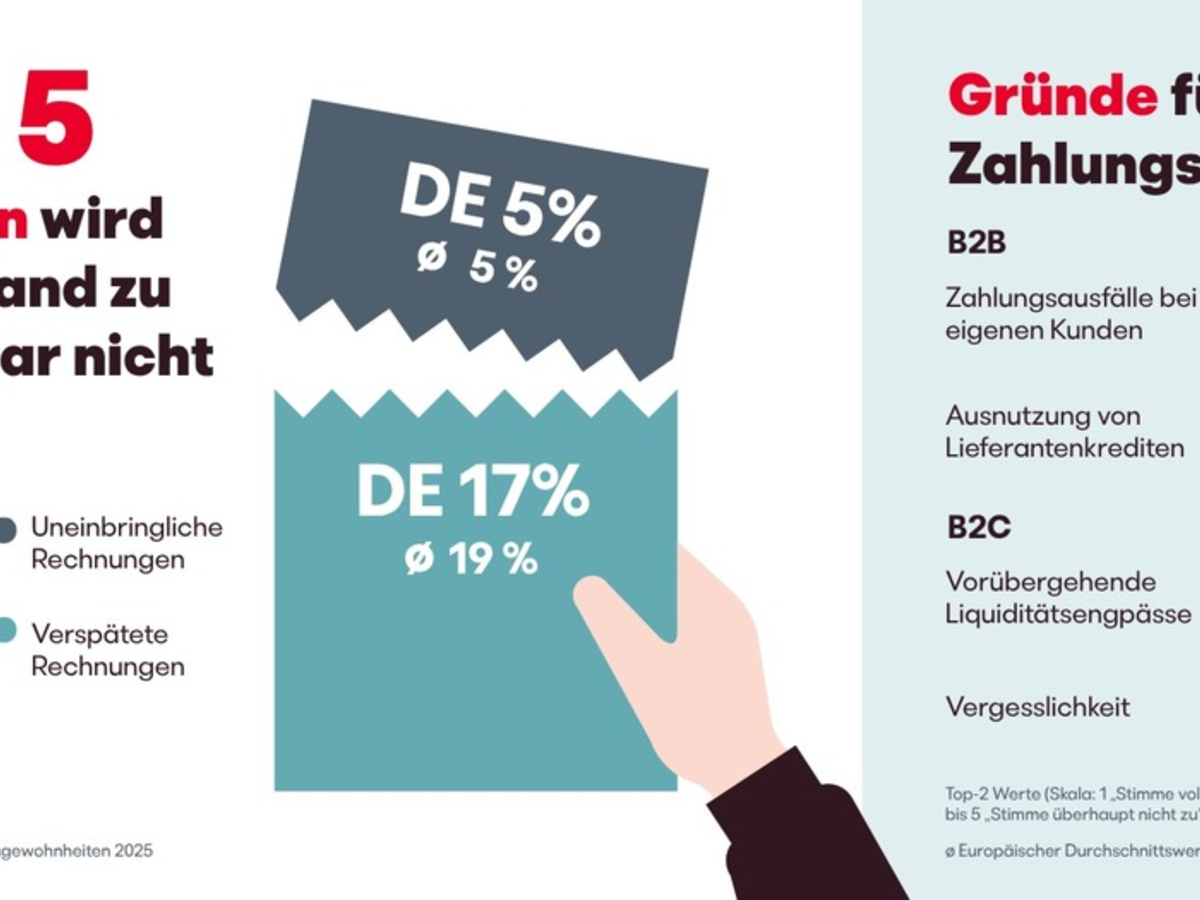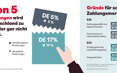 Als GrĂŒnde fĂŒr die schlechte Zahlungsmoral bei ihren GeschĂ€ftskunden vermuten jeweils 47 Prozent der Befragten in Deutschland ZahlungsausfĂ€lle bei den eigenen Kunden und das Ausnutzen von Lieferantenkrediten. Bei Privatkunden werden vor allem vorĂŒbergehende LiquiditĂ€tsengpĂ€sse (50 Prozent) und Vergesslichkeit genannt (47 Prozent). FĂŒr Unternehmen besonders herausfordernd: Viele Befragte gehen davon aus, dass Kunden ihre Rechnung absichtlich nicht fristgerecht begleichen. Mit Blick auf GeschĂ€ftskunden Ă€uĂern 18 Prozent diese Vermutung, bei Privatkunden gehen sogar 24 Prozent davon aus.