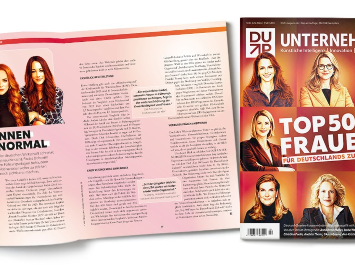 Wie schon im Vorjahr setzt das DUP UNTERNEHMERIN-Magazin, das am 17. April 2025 am Kiosk erscheint und am kommenden Wochenende zudem der Süddeutschen Zeitung sowie der Frankfurter Allgemeinen Sonntagszeitung beiliegt, mit der Ehrung "Top 50 Frauen für Deutschlands Zukunft" ein deutliches Zeichen, dass weibliche Führung sichtbarer werden muss. Für die Ausgabe 2/26 (Mai-Juni) hat sich DUP UNTERNEHMER deshalb in DUP UNTERNEHMERIN umbenannt. Damit macht das Wirtschaftsmagazin auf die weiterhin bestehende Unterpräsentation von Frauen in Vorständen und auf politischen Entscheidungsebenen aufmerksam. Die Würdigung wird als Impuls für mehr Vielfalt, neue Perspektiven und gelebte Role-Models in Unternehmen und Institutionen verstanden.