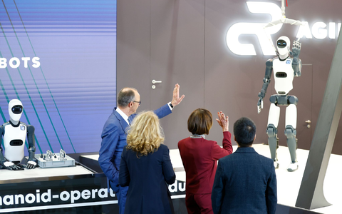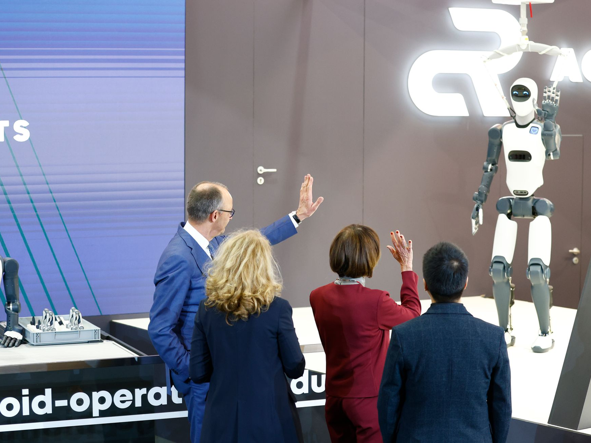 • Bundeskanzler Friedrich Merz winkt einem Roboter zu – die Zukunft winkt zurück. - Foto: Michael Matthey/dpa