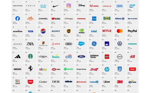 2024 steigen Nvidia (#36; 20,0 Milliarden US-Dollar), Uber (#78; 9,2 Milliarden US-Dollar), Pandora (#91; 7,1 Milliarden US-Dollar), Range Rover (#96; 6,6 Milliarden US-Dollar), LG (#97; 6,5 Milliarden US-Dollar) und Jordan (#99; 6,4 Milliarden US-Dollar) in die Rangliste ein.