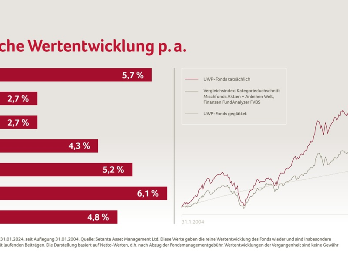 Dieses Ziel wurde erreicht: Seit Auflegung am 31.01.2004 erzielte der UWP-Fonds eine Performance von 4,8 % p.a. Der aktiv gemanagte Mischfonds investiert zurzeit zu rund 50 % in Sachwerte wie weltweite Aktien, Immobilien, private Equity und Infrastruktur. Hinzu kommen festverzinsliche Wertpapiere.
