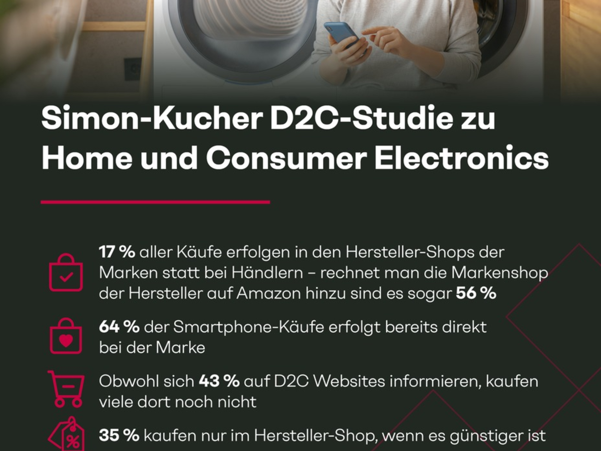 Laut der Simon-Kucher D2C-Studie 2025 entscheiden sich Käufer von Home- und Consumer-Electronics-Produkten bereits in 17 Prozent der Fälle für D2C-Käufe in Markenapps, Webshops und Ladengeschäften. Weitere 39 Prozent erwerben Produkte in den Markenshops der Hersteller auf Amazon, die teilweise selbst durch die Hersteller verwaltet werden.