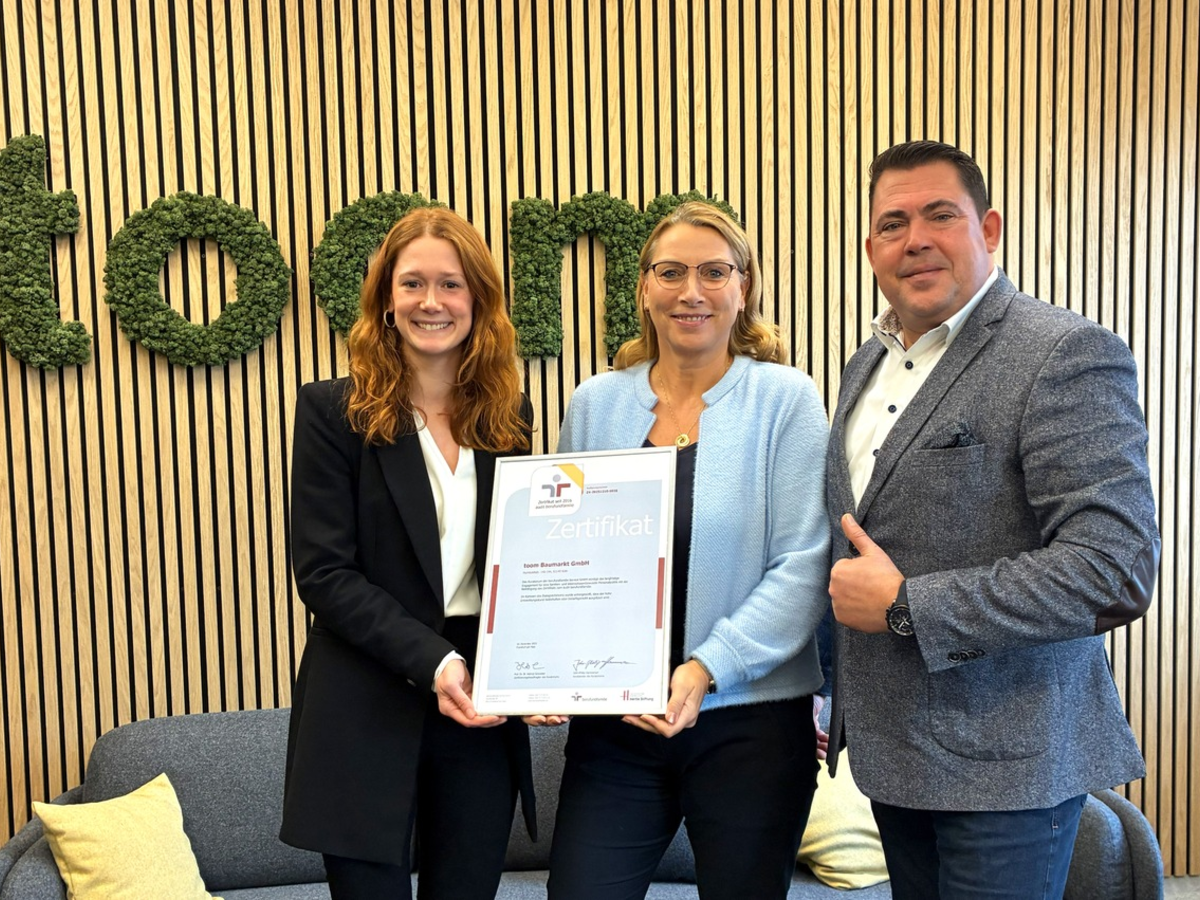 Köln - toom hat sich zum vierten Mal in Folge erfolgreich dem audit berufundfamilie gestellt und erneut das Zertifikat für eine besonders familien- und lebensphasenbewusste Personalpolitik erhalten. Die Baumarktkette, die 2016 als erster Baumarkt in Deutschland das Audit durchlief, nahm die offizielle Rezertifizierung am bereits im Dezember 2025 entgegen. Damit bestätigt das Unternehmen seit nunmehr zehn Jahren konsequent seinen Einsatz für die Vereinbarkeit von Beruf und Privatleben. Das Zertifikat gilt für weitere drei Jahre.