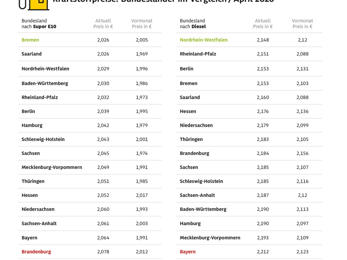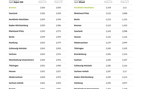 Am günstigsten tanken die Autofahrer aktuell in Bremen und Nordrhein-Westfalen. In der Hansestadt kostet ein Liter Super E10 im Mittel 2,026 Euro und damit 5,2 Cent weniger als in Brandenburg. Preiswertestes Bundesland für Dieselfahrer ist Nordrhein-Westfalen mit einem Durchschnittspreis von 2,148 Euro je Liter. Diesel ist damit im bevölkerungsreichsten Bundesland 6,4 Cent billiger als im größten deutschen Flächenland Bayern. Tendenziell sind dichter besiedelte Bundesländer, in denen es auch eine höhere Anzahl an Tankstellen gibt, etwas günstiger, weil dort mehr Konkurrenz besteht.
