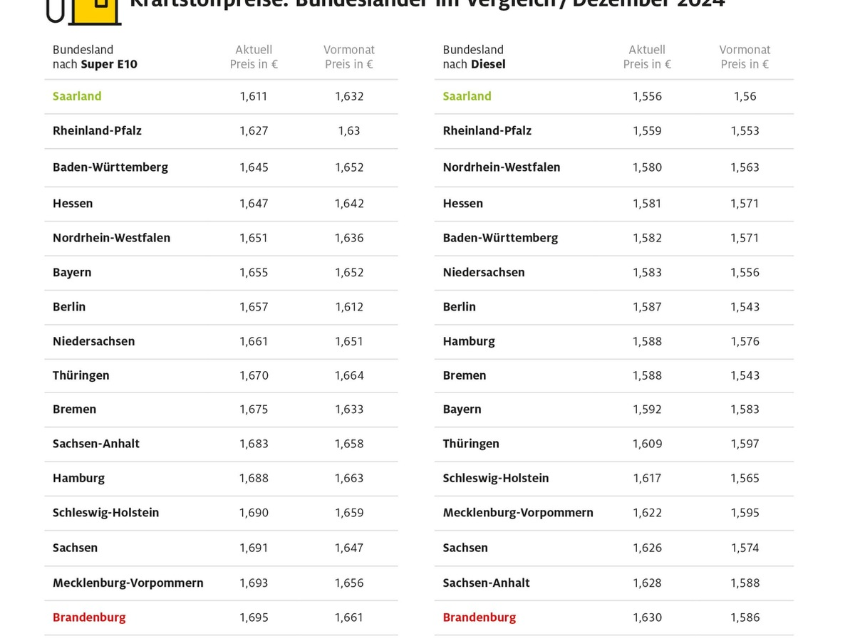 Tanken im Saarland am günstigsten / Autofahrer in Brandenburg zahlen die höchsten Spritpreise / Preisdifferenzen zwischen den Bundesländern spürbar gewachsen