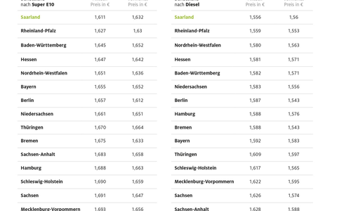 Bei Diesel ergibt sich - zumindest bei den beiden Spitzenplätzen und beim Letztplatzierten - das gleiche Bild. Das Saarland liegt mit 1,556 Euro auf Platz 1, wieder gefolgt von Rheinland-Pfalz mit 1,559 Euro. In Brandenburg als Schlusslicht kostet ein Liter Diesel 1,630 Euro. Vorletzter ist hier Sachsen-Anhalt mit 1,628 Euro je Liter des Selbstzünderkraftstoffs.