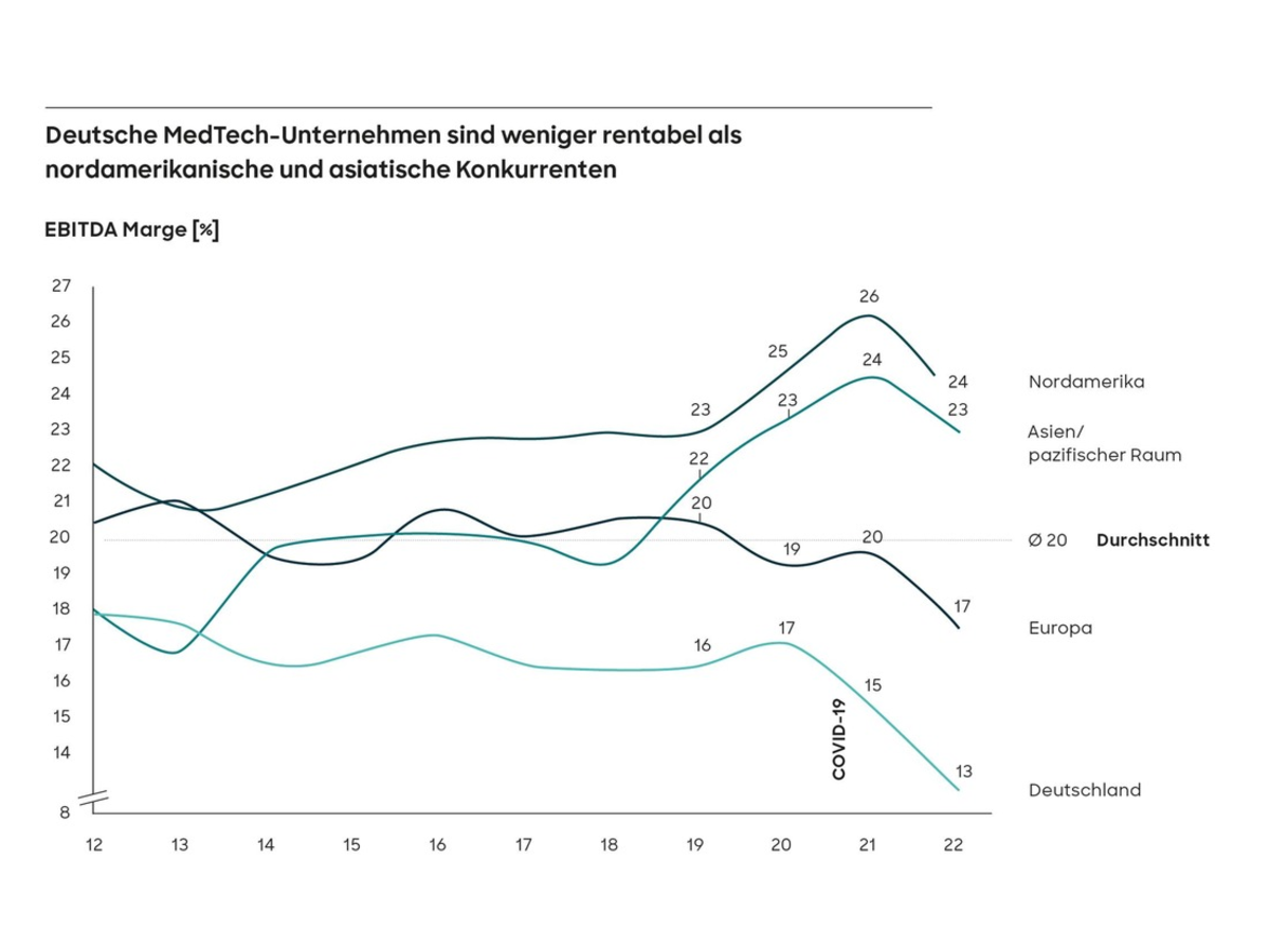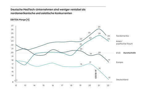 Dabei zeigt die Analyse deutliche Unterschiede, sowohl regional als auch sektoral: So ist der Anteil der Unternehmen mit unterdurchschnittlicher Leistung in Deutschland größer als in Resteuropa, Nordamerika oder dem asiatisch-pazifischen Raum. Während etwa in den USA und Kanada die durchschnittlichen Margen von Mitte 2022 bis Mitte 2023 von 25 auf 22 Prozent zurückgingen, sank das EBITDA europäischer MedTech-Unternehmen von 20 auf nur noch 17 Prozent des Umsatzes; in Deutschland von 17 auf 14 Prozent.