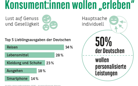Am liebsten investieren die EuropĂ€er:innen - inklusive der Deutschen - in Urlaubsreisen und Kurztrips. Das gibt rund ein Drittel der Befragten an. Auf dem zweiten Platz folgen in Deutschland Lebensmittel und GetrĂ€nke (28 Prozent, Europa: 23 Prozent). Beinahe jede:r FĂŒnfte in Deutschland und Europa gibt das Geld sehr gerne fĂŒrs Ausgehen aus: Restaurants, Bars, Theater, Konzerte. Das Smartphone fĂŒr den digitalen Konsum steht bei 14 Prozent der Deutschen und 17 Prozent der EuropĂ€er:innen ganz oben auf der Ausgabenliste. Andere Dinge rund um das Entertainment wie BĂŒcher, Musik oder Comics sind bei 13 Prozent der Deutschen und 14 Prozent der EuropĂ€er:innen gefragt.