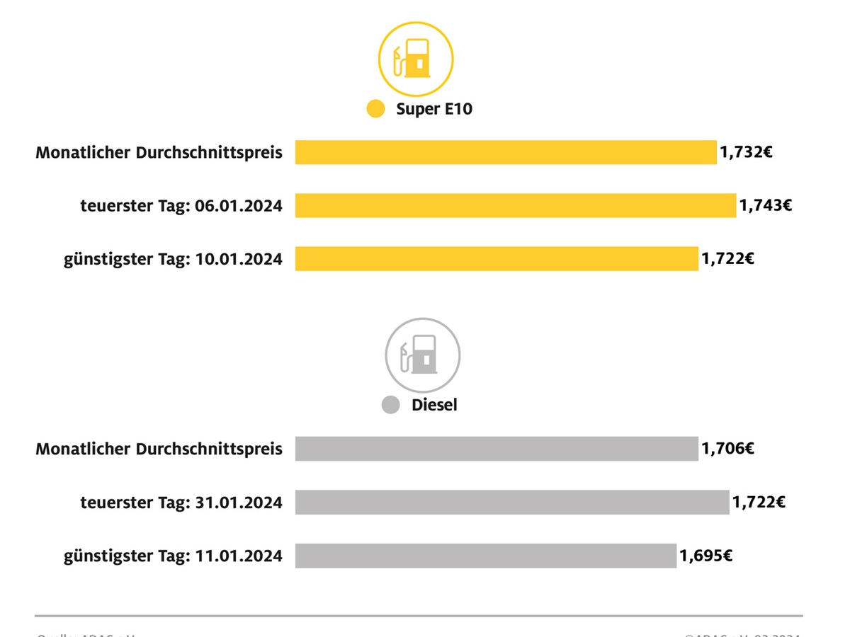 Tanken im Januar: Kaum Ausschläge bei den Preisen / ADAC Monatsbilanz zum Jahresbeginn: Super E10 kostete im Schnitt 1,732 Euro je Liter, Diesel 1,706 Euro