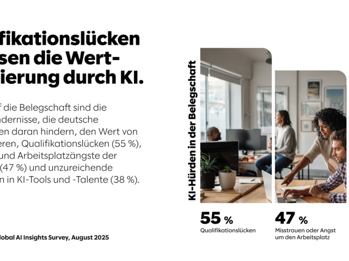 Der Transformationswille ist vorhanden, doch kämpfen Unternehmen mit erheblichen Hindernissen. Mit Blick auf die Belegschaft identifiziert mehr als die Hälfte der Befragten (55 Prozent) Qualifikationslücken als größtes Hindernis für die unternehmensweite KI-Umsetzung. 47 Prozent nennen Misstrauen und Arbeitsplatzängste der Mitarbeiter als zweitgrößte Barriere. Nur 38 Prozent sehen unzureichende Investitionen für KI-Tools und -Talente als Problem und 34 Prozent sagen, dass strukturierte KI-Schulungen fehlen. "Oft sitzen die wertvollsten Talente bereits in den Unternehmen - sie müssen nur richtig unterstützt werden. Wer heute in Maßgeschneiderte Lernstrategien investiert, verwandelt seine bestehende Belegschaft in die KI-Champions von morgen", betont Maruschke.