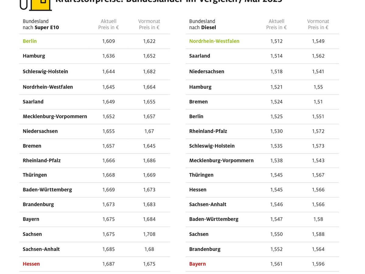 Die Preisunterschiede zwischen den teuersten und den günstigsten Bundesländern sind bei Benzin ausgeprägter als bei Diesel. Bei Super E10 beträgt der Abstand zwischen Berlin und Hessen 7,8 Cent, im Diesel-Ranking sind es nur 4,9 Cent zwischen Nordrhein-Westfalen und Bayern.