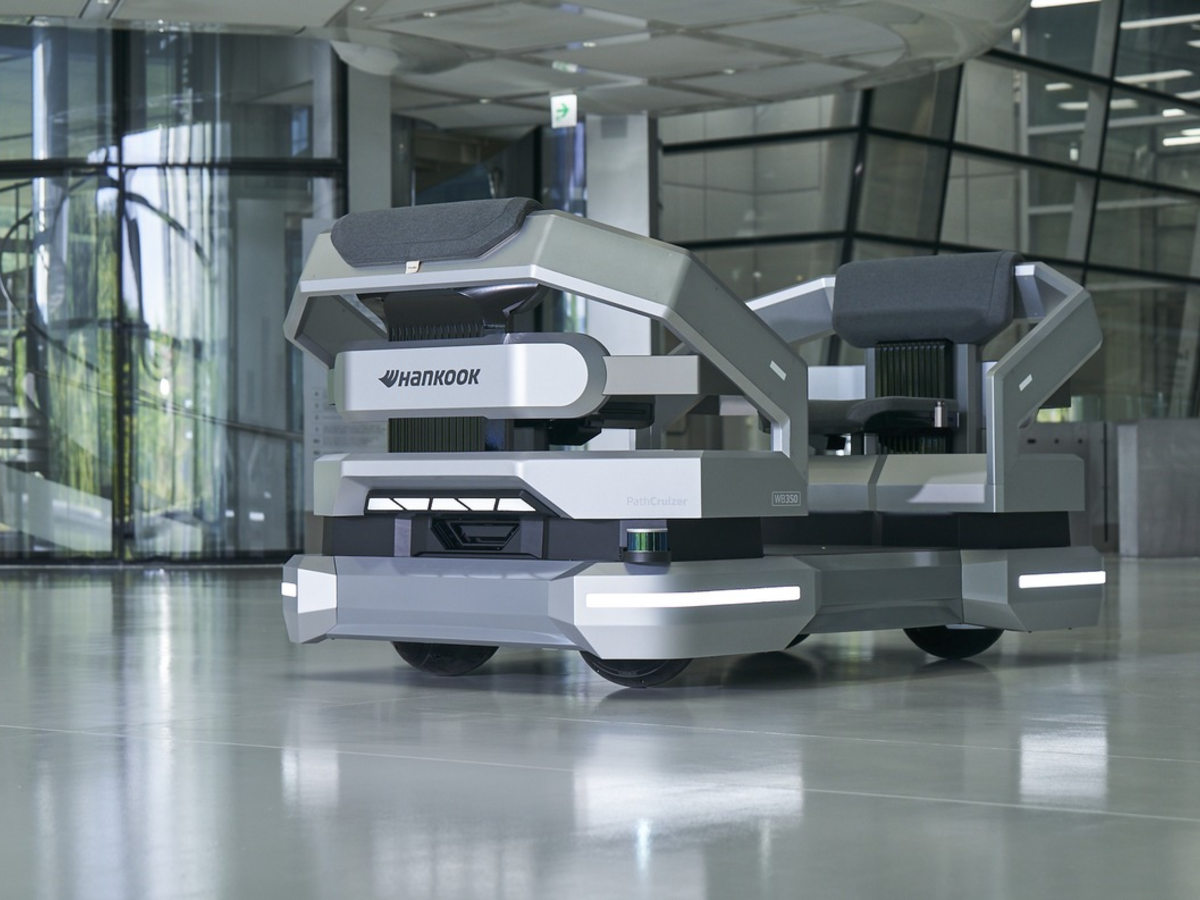 Zukunftsweisend ist auch der zweisitzige Personentransporter PathCruizer, der von der Roboter-Plattform WheelBot 2 angetrieben wird. Das geschieht ĂŒber spezielle KugelrĂ€der, die in alle Richtungen rollen können. Dadurch fĂ€hrt der PathCruizer seitwĂ€rts, diagonal oder dreht sich auf der Stelle â ideal fĂŒr prĂ€zises Manövrieren in den Gangways von FlughĂ€fen oder als flexibles Transportmittel in urbanen MobilitĂ€ts-Hubs. Entwickelt hat Hankook die Technologie zusammen mit dem Robotik-Startup CALMANTECH.