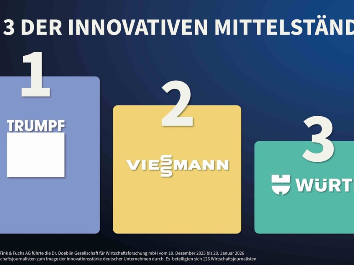 Als Vorbilder können die mittelständischen Unternehmen dienen, die von den Wirtschaftsjournalist:innen am häufigsten als innovativ benannt werden: Trumpf, Würth und Viessmann stellen die Top 3 dar. Ausschlaggebend ist laut Befragten das Zusammenspiel aus technologischer Exzellenz, strategischem Weitblick, Stabilität - und überzeugender Kommunikation.