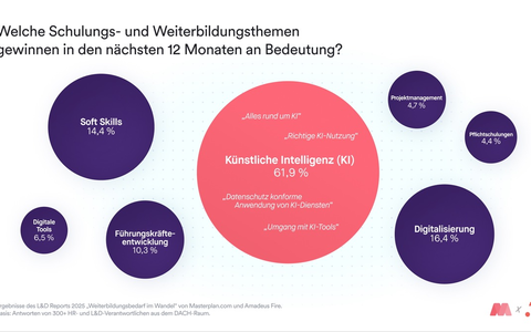 Der L&D Report 2025 - Weiterbildungsbedarf im Wandel untersucht den Status quo, den künftigen Trainingsbedarf und die digitale Infrastruktur von Unternehmen im DACH-Raum. Grundlage sind die Antworten von über 300 HR- und L&D-Verantwortlichen, erhoben im September 2025. Herausgeber sind Masterplan.com, eine der führenden Lernplattformen für betriebliche Weiterbildung, und die Muttergesellschaft Amadeus Fire, einer der führenden Anbieter für Personaldienstleistungen, spezialisierte Weiterbildung und Consulting.