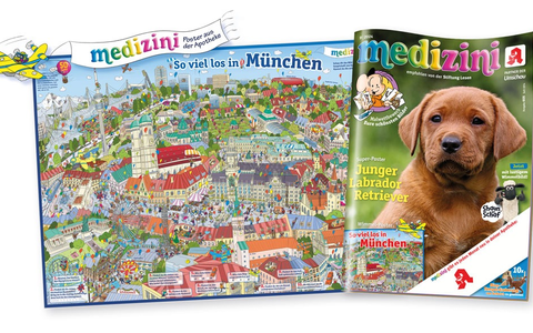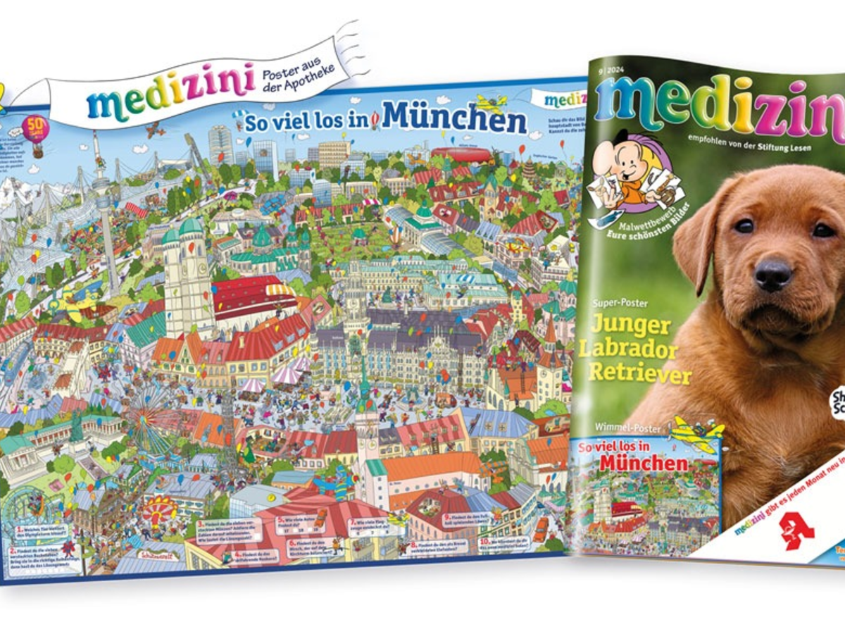 Zum Start der Wiesn, dem größten Volksfest der Welt, präsentiert das Apotheken-Kindermagazin medizini ein tolles Wimmelbild von München. Das detailreiche Poster lädt Kinder und Erwachsene gleichermaßen ein, die bayerische Landeshauptstadt auf spielerische Art und Weise zu entdecken: vom Marienplatz mit dem berühmten Glockenspiel über den Viktualienmarkt und den Stachus bis hin zum Englischen Garten und dem Olympiazentrum sowie natürlich der Theresienwiese, dem Schauplatz des Oktoberfests.