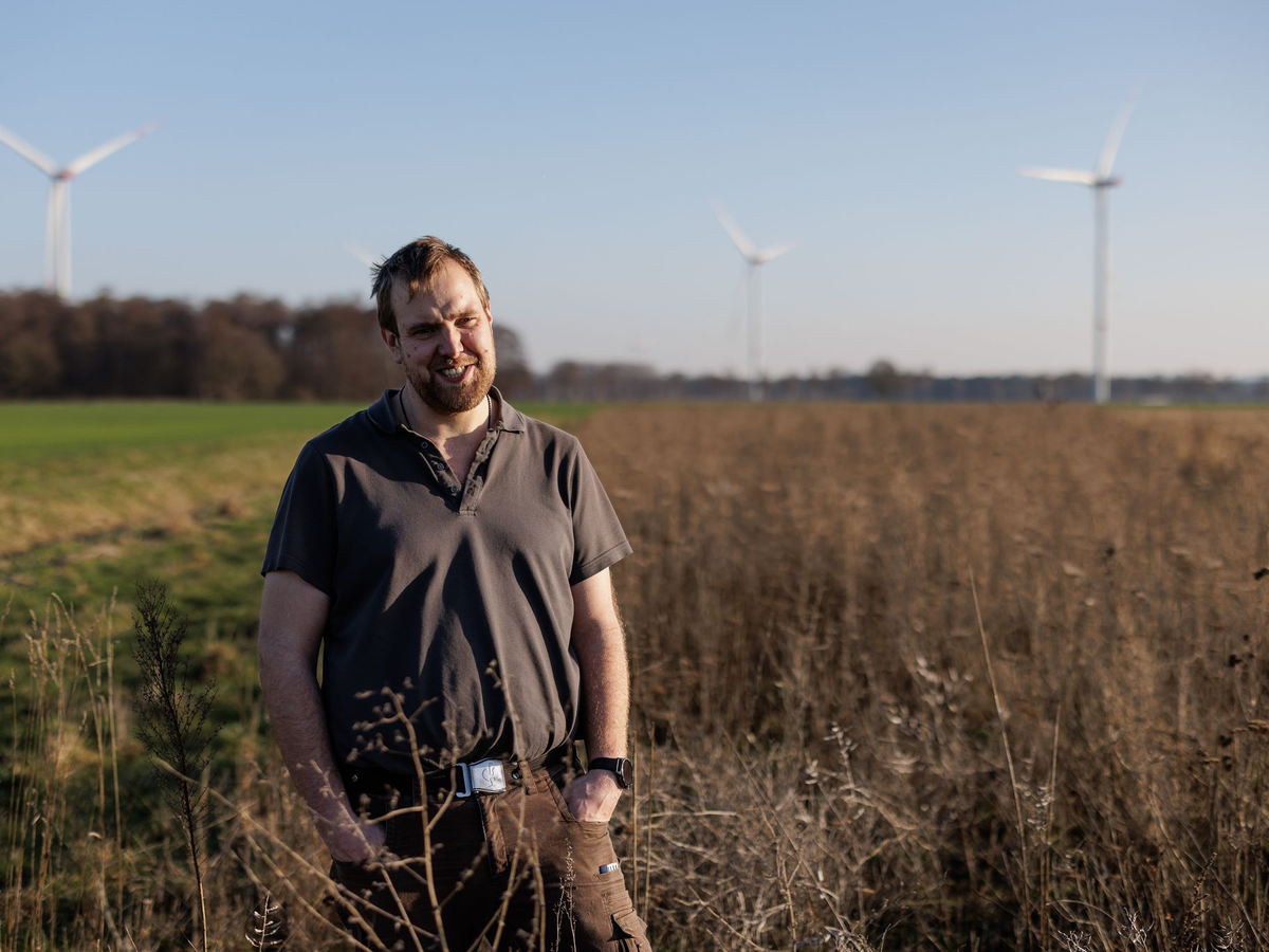 Landwirt Christian Wiese lebt und arbeitet unweit von Brockum in Stemwede in Nordrhein-Westfalen. Die Landesgrenze zu Niedersachsen verlĂ€uft unsichtbar irgendwo zwischen den WindrĂ€dern hinter ihm. Bereits seit fĂŒnf Jahren ist er fĂŒr das Rebhuhn dabei, schafft «Unterschlupf, Nahrung, Sicherheit». Direkt neben BlĂŒhpflanzen stehen weitere Pflanzen und Getreide, die nicht geerntet wurden.Â
