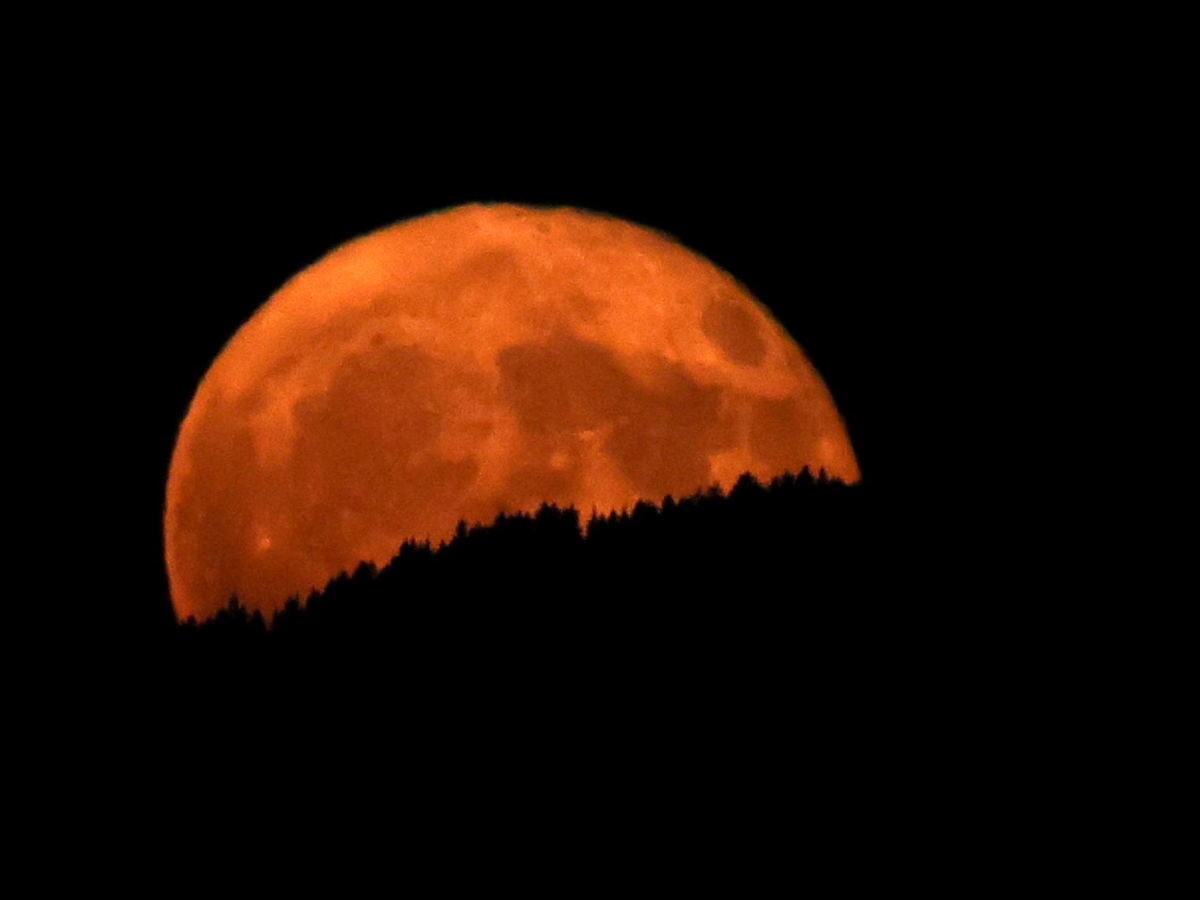 In Oberbayern wirkte der aufgehende Erdbeermond hinter dunklen Wäldern besonders groß. - Foto: Karl-Josef Hildenbrand/dpa