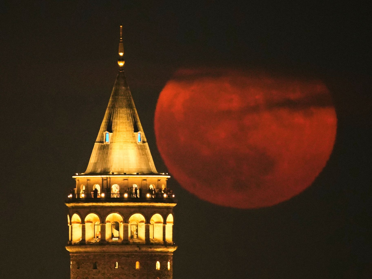 Der Erdbeermond geht hinter dem Galata-Turm in Istanbul auf. - Foto: Emrah Gurel/AP/dpa