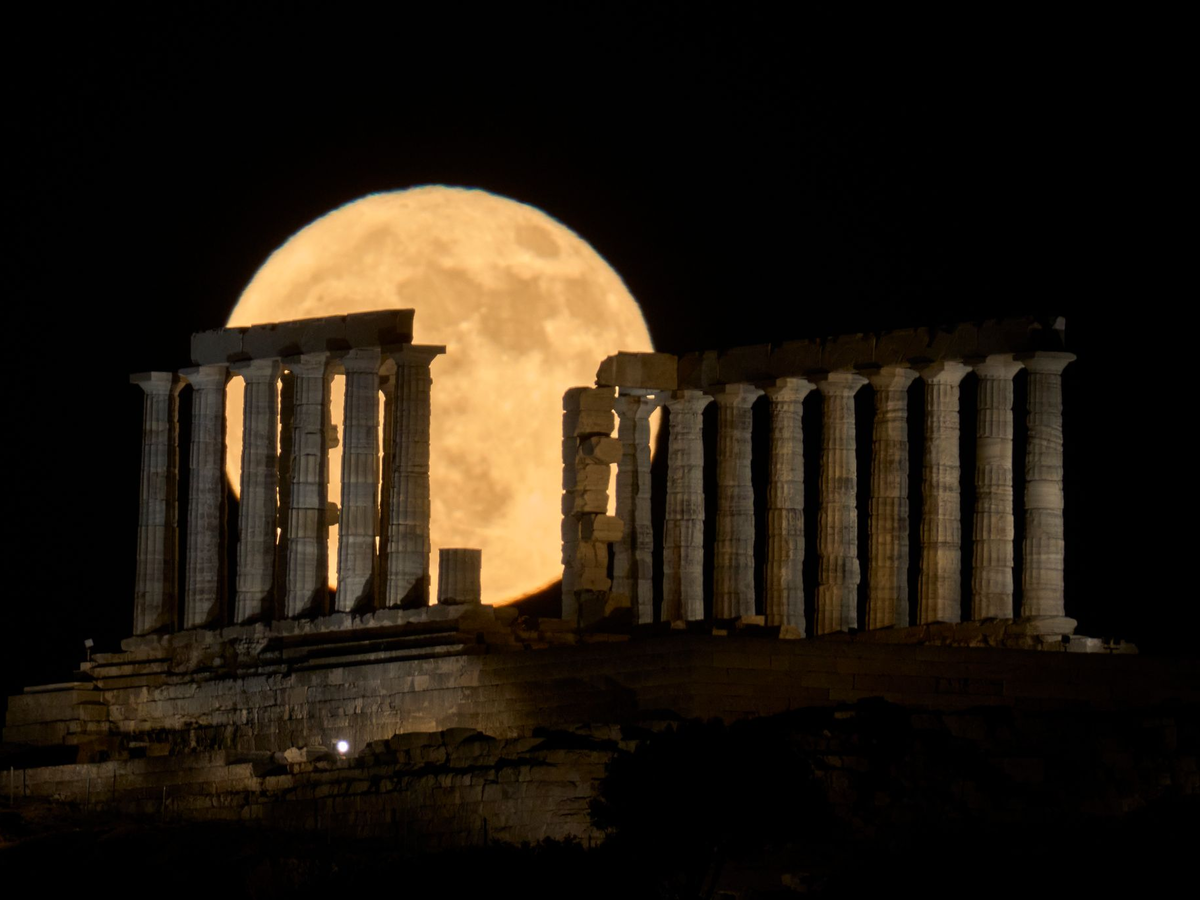 Der Erdbeermond geht in Griechenland hinter dem Poseidontempel am Kap Sounion auf. - Foto: Petros Giannakouris/AP/dpa