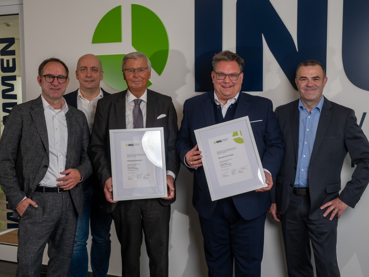 Die Ehrensenator-Würde wurde Bernhard Schindler und Wolfgang Bosbach von Prof. Dr. Eckehard Krah (Dekan der INU) in Vertretung von Prof. Dr. Christian Dries, Gründungspräsident der INU - Innovative University sowie von Prof Dr. Marcus Pradel am INU-Campus in Köln im Rahmen einer Feierstunde überreicht.