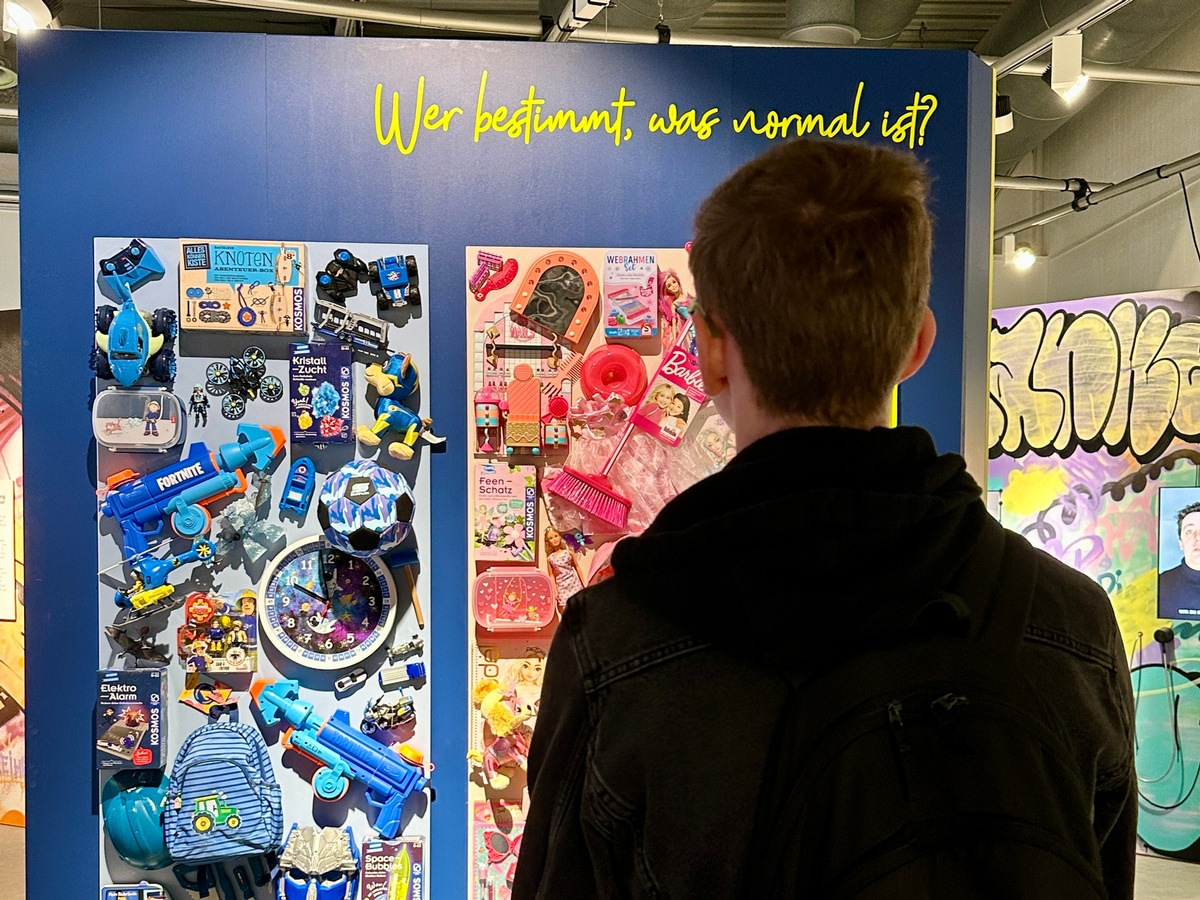 Die Ausstellung verdeutlicht spielerisch, wie Vorurteile und diskriminierendes Verhalten entstehen. Außerdem kommt sie der Macht der Sprache auf die Spur und hinterfragt gängige Floskeln und Aussagen. Wer außerdem ein Job-Speed-Dating ausprobieren möchte, erfährt dabei, mit wie vielen Klischees die Berufswahl oft aufgeladen ist. Auch ein Abstecher in die Vergangenheit ist möglich. Auf einem Zeitstrahl reisen die Besuchenden ins Gestern und ordnen Meilensteine in der Geschichte der Gleichberechtigung Jahren und Ereignissen zu.