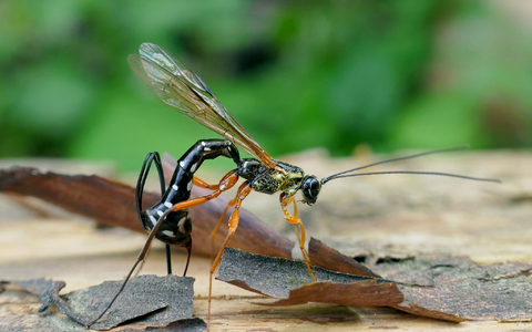 Ist die Stelle lokalisiert, bohrt sich das Schlupfwespen-Weibchen mit seinem Hinterleib bis zu 30 Minuten lang zu den Holzwespen-Larven vor, die tief im Holz verborgen sind, und legt auf jede Larve ein Ei. Die Schlupfwespen-Larve frisst die Holzwespen-Larve auf und verringert dadurch die Notwendigkeit für den Einsatz chemischer Mittel.