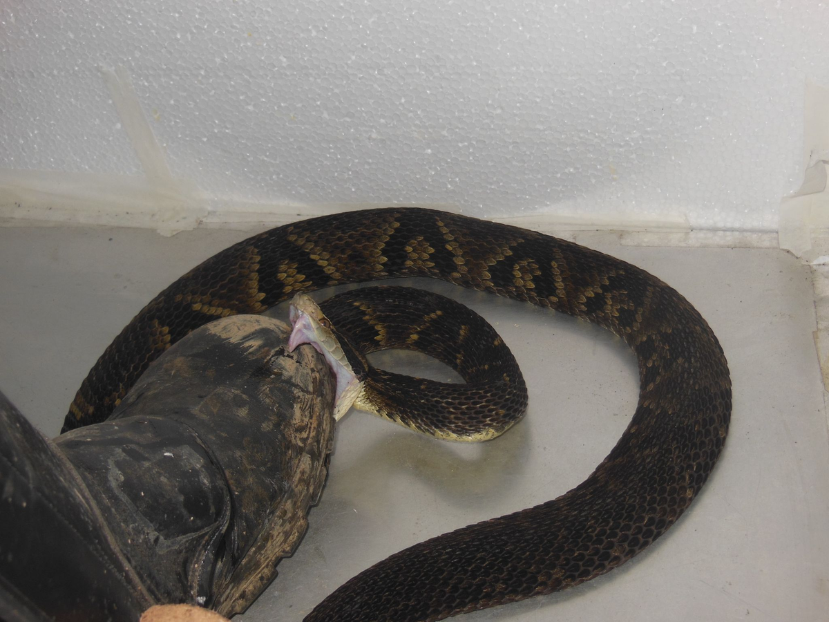 «Ich habe 116 Tiere getestet und bin 30 Mal auf jedes Tier getreten.» Während der mehrtägigen Testreihe sei er insgesamt 40.480 Mal auf und neben die Schlangen getreten.